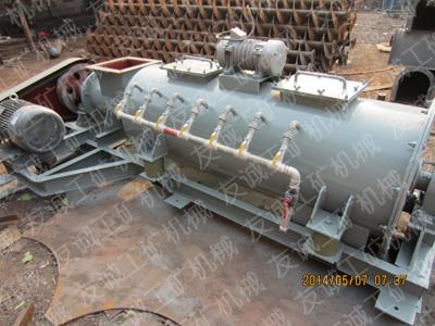 單軸粉塵加濕攪拌機(jī)主要用于電力,冶金等行業(yè)的多管除塵器,電除塵器,重力除塵器及其它親水性好,粘性較差物料的排放處理、通過本機(jī)的攪拌加濕,使干料變?yōu)榫鶆蚨睗竦奈锪希?避免了卸料和運(yùn)輸過程中產(chǎn)生的二次揚(yáng)塵問題、本設(shè)備安裝在灰?guī)?,灰斗下部,由葉輪料機(jī)把干灰均勻地輸入到機(jī)內(nèi),通過旋轉(zhuǎn)的帶螺旋葉片的棘輪把干粉灰攪拌打散,同時(shí)加入適量的水進(jìn)行強(qiáng)制混合,并將達(dá)到預(yù)訂濕度的混合料推向出料口排出,達(dá)到加濕排放、本設(shè)備由均勻供料,葉片輸料加水混合擊打加濕構(gòu)成,該設(shè)備結(jié)構(gòu)簡單,密封良好,處理量大,攪拌扭矩大等特點(diǎn)。
